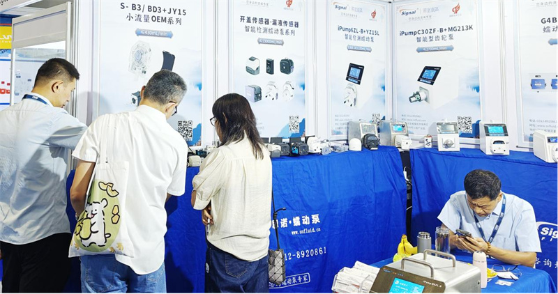 思諾流體攜眾多新品亮相展會,有智能檢測蠕動泵產品,半自動灌裝流水線,AI智能蠕動泵、灌裝系統蠕動泵,新研發的蠕動泵泵頭和OEM等,我們的銷售人員以專業的講解以及現場展示,向各位參展商講解產品亮點。