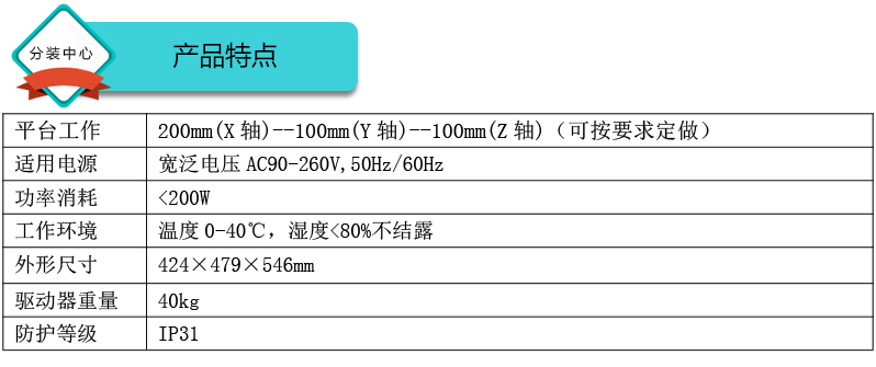 ? ? ?1.桌面型設計,占用空間小,適用于批量流水分裝作業 ? ? ?2.轉速高達300mm/s,高耐久性 ? ? ?3.重復精度:±0.02mm-0.05mm ? ? ?4.可存儲999個工藝文件 ? ? ?5.執行單元:分配型蠕動泵或灌裝系統 ? ? ?6.可實現32通道分裝