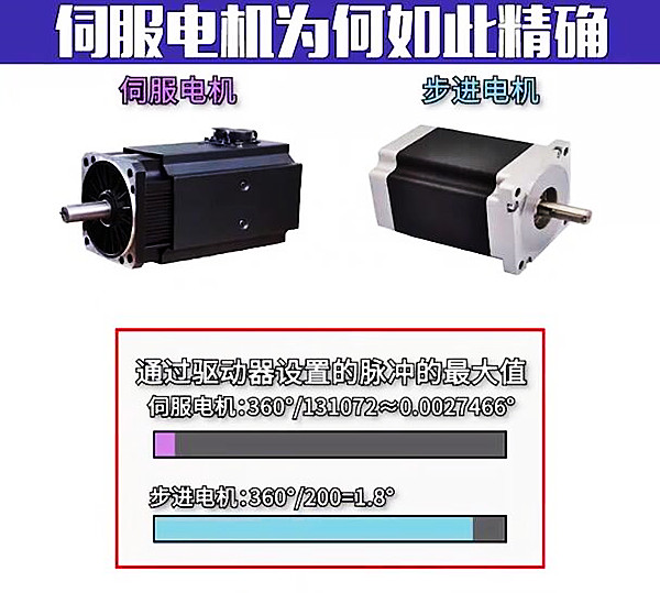 伺服和步進所指電機部分,伺服電機和步進電機一樣都是電機走一圈,脈沖數(shù)越大每一步的角度就越小精度就越高,而伺服電機軸后端如果是17位編碼器的話,那么驅動器每接收131072個脈沖信號電機才轉一圈,也就是它走一下,僅移動了0.0027°,那么它步進角為1.8°步進電機的655倍,而大部分步進電機只能設置到25000個脈沖, 所以說伺服電機的精度是步進電機,同時伺服電機是閉環(huán)控制,有效的反饋也了電機。